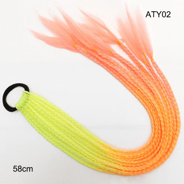 Met de kleurenvlechtjes kun je jezelf aantrekkelijker en opvallender te maken. Je kunt je haar versieren zoals je wilt, en het is ideaal voor dagelijks gebruik, feesten, festivals, concerten, kostuums of andere gelegenheden. Ze zijn heel gemakkelijk om te dragen. elke gevlochten haarextensies zijn bevestigd in een zachte elastische rubberen band, je hoeft alleen maar je haar te verzamelen en vast te binden met deze synthetische haarvlechtextensies, en je hebt geen extra haaraccessoires nodig. Verder is het heel gemakkelijk om schoon te maken en te onderhouden.