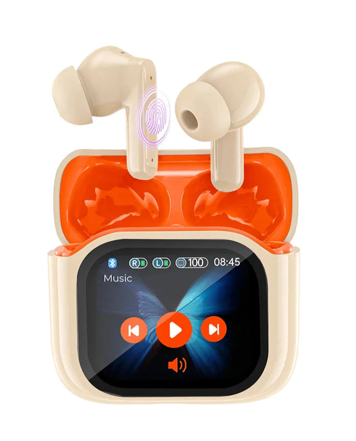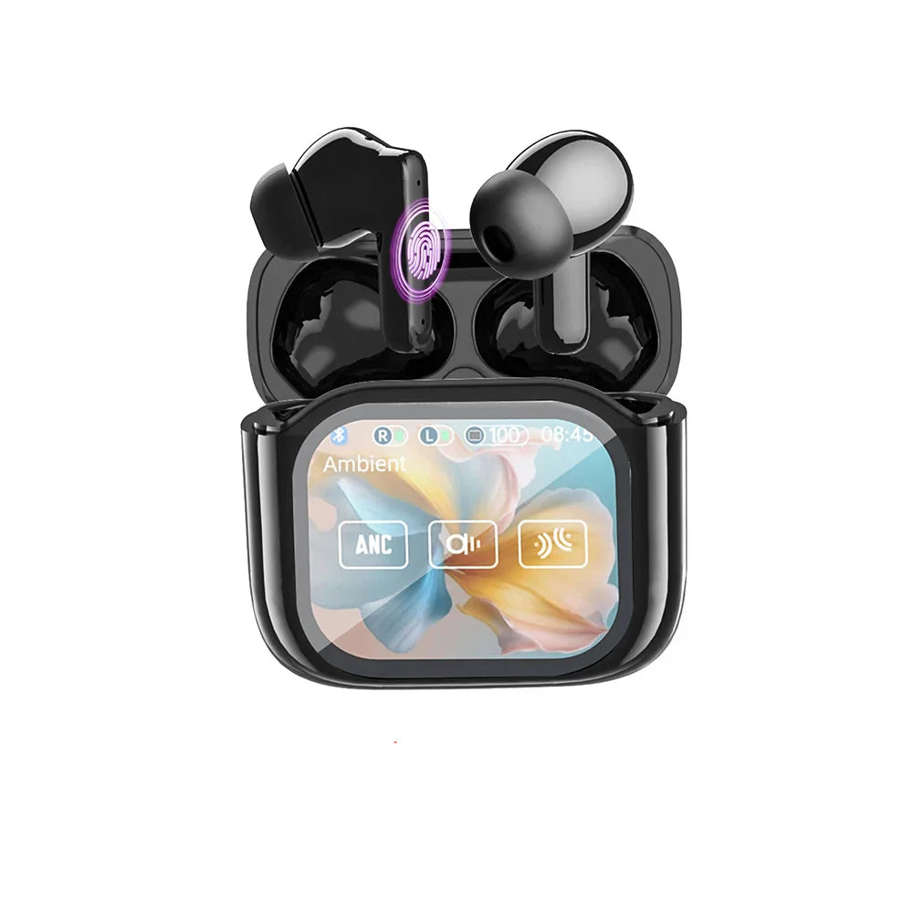 Geen AI → Standaard Bluetooth 5.4-oordopjes met touchscreen, ruisonderdrukking, EQ-modi, waterdicht ontwerp en snel opladen.