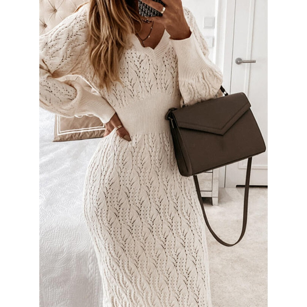 Elegante Beige Trui Jurk | Herfst Elastische Lange Mouw V-Hals Gebreide Midi Feestkleding