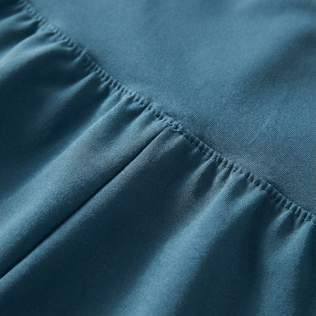 De buitenlaag zit losjes en verbergt probleemgebieden zonder op te dragen. De hoge taille vormt een flatterend silhouet.