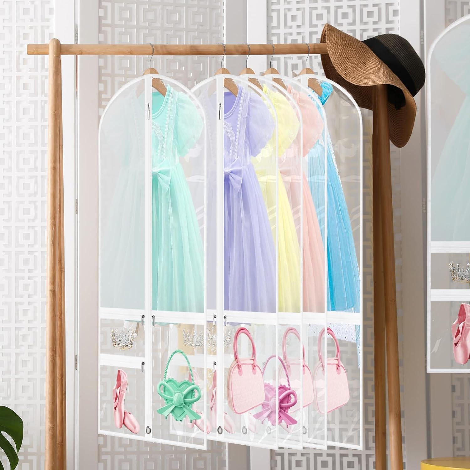 Keep your costumes protected and your accessories organized with this 5-pack of foldable garment bags – now with an extra set free. Made from breathable PEVA+PVC, these bags protect your dancewear or formal clothing from dust and moisture. Each bag has a transparent front window for easy identification and three zippered pockets for storing shoes, hair accessories, and small essentials. The bottom eyelet allows the bag to fold in half for easy transport, making it ideal for travel, competitions, or wardrobe organization.
