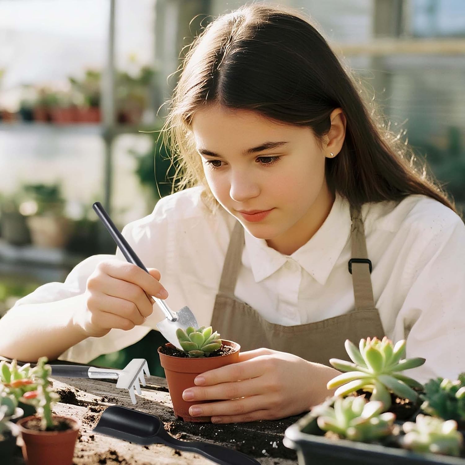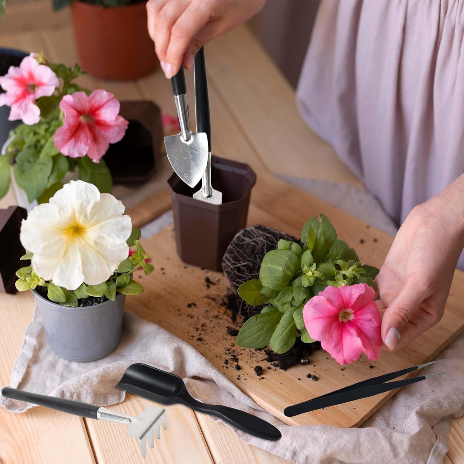 This 12-piece succulent care kit includes scissors, shovels, a rake, a hole punch, a spoon, tweezers, and a linen storage bag. Designed for repotting, pruning, and weeding, it's lightweight and compact at just 165g. The steel tool tips and reusable storage bag keep everything organized, perfect for caring for indoor plants or as a gift.