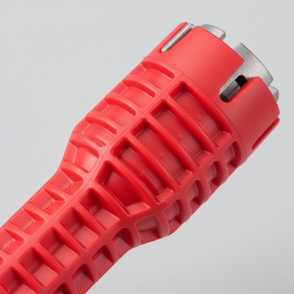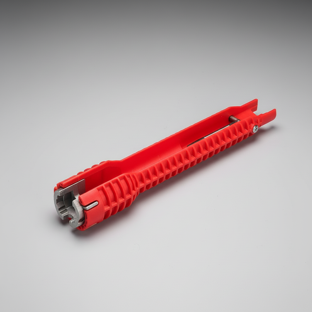 Under sinks and in narrow cabinets, hands often cannot reach nuts and valves. This tool solves the problem with an open slot and a slim shape that fits over existing supply lines. It combines lightweight plastic parts with a strong aluminum alloy for safe operation. Various inserts effortlessly grip common nuts such as strainer baskets and supply nuts.